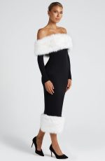 The Vittoria Midi Dress in Black/White exudes timeless elegance. Crafted from luxurious stretch crepe, this bodycon dress features a flattering bardot neckline that beautifully frames the shoulders, while the contrast faux fur detailing on the neckline and hem adds a touch of opulence. The long sleeves and pencil-shaped skirt provide a sleek silhouette.