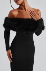 A cosy must-have – meet Vittoria, our fur trimmed, bardot midi dress. Made with plush faux fur trimmed neckline and hemline, the design has long sleeves, pencil shaped skirt and hugs every inch of your curves.