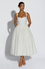 The Vivienne Midi Dress in Ivory Sparkle features a boned bodice and corset-shaped waist for an elegant silhouette. Its wide square neckline and tapered straps enhance sophistication, while the gathered full skirt with internal tulle adds graceful movement and volume.