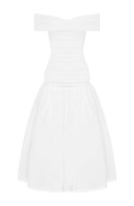 A dreamy dress made for new beginnings, say hello to Wilhelmina. This chic midaxi design features a dropped waist and full skirt, gathered at the seam. The skirt is complemented by a figure-hugging body with pleated bardot neckline to show off your shoulders. Style with strappy heels for your next dinner reservation.