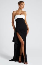 Make a statement in the Zafira Maxi Dress in contrast Black and White, a stunning blend of drama and elegance. Crafted from luxurious stretch crepe fabric, this maxi length gown features a strapless neckline with a pleated panel that accentuates the bust. The draped thigh-high split and asymmetric pleats at the waist create a flattering silhouette while ensuring effortless movement.