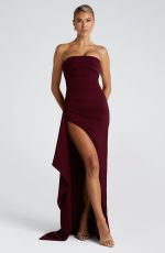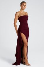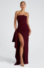 The Zafira Maxi Dress in Plum Brown exudes elegance and sophistication, crafted from luxurious stretch crepe for a flawless fit. The strapless gown is designed with a flattering pleated panel on the bust and asymmetric pleats at the waist to beautifully sculpt your silhouette. The thigh-high split with draped detail introduces an alluring touch of sensuality and movement.